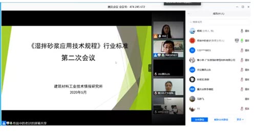 中國散協(xié)團體標準《濕拌砂漿應用技術規(guī)程》第二次標準編制工作會議于2020年5月22日上午9:30-11:30以網絡會議的形式召開。中國散裝水泥推廣發(fā)展協(xié)會秘書長、建筑材料工業(yè)技術情報研究所混凝土發(fā)展中心主任孫繼成博士、中國散裝水泥推廣發(fā)展協(xié)會專家委員計海霞高工、建筑材料工業(yè)技術情報研究所標準編制工作組楊莉、中建西部建設北方有限公司技術中心經理張凱峰、成都精準混凝土有限公司經理馬占民、山東弗爾曼新材料集團有限公司經理肖維錄、主任薛俊書、廣東浪淘砂新型材料有限公司研發(fā)中心主任曹小榮、黃山精強建材股份有限公司副總經理程楷、四川同舟化工有限公司技術片區(qū)負責人鄧奎、中信國安建工集團有限公司總工張學華、麗水市處州混凝土有限公司總經理楊磊、實驗室主任金滿昌;株洲市中建新材料有限公司總經理陳新、青島國基商砼有限公司郇建、昆明匯森混凝土有限公司杜顯茂等41名代表參加了會議。會議由建筑材料工業(yè)技術情報研究所楊莉主持。首先主編單位中國散裝水泥推廣發(fā)展協(xié)會秘書長、建筑材料工業(yè)技術情報研究所孫繼成博士介紹了標準編制要求以及編制工作進度計劃。隨后,中國散裝水泥推廣發(fā)展協(xié)會專家委員、主編單位標準編制負責人計海霞高工就濕拌砂漿行業(yè)現狀、標準中創(chuàng)新點和關鍵點進行介紹。標準編制組建筑材料工業(yè)技術情報研究所楊莉詳細介紹了標準文本及條款編制說明,并組織參會代就凝結時間、保塑時間、14拉伸粘結強度等關鍵技術參數進行交流討論,廣泛征集參編單位意見。該會議的召開對標準編制工作起到了大的推進作用。標準編制負責人計海霞高工標準編制組工程師楊莉